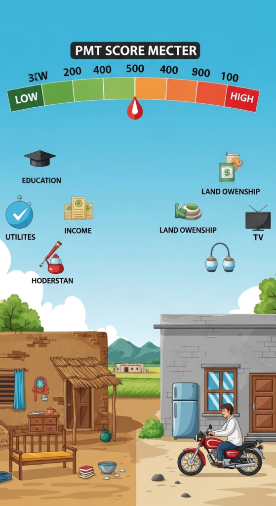 The core idea behind PMT is that certain observable household characteristics — things that trained enumerators can see and verify during a home visit — serve as reliable proxies for a household’s economic status. A household with concrete walls, a television, a refrigerator, and a motorcycle is likely better-off than a household in a mud-walled structure with no appliances and no vehicle, even if both households report similar incomes.